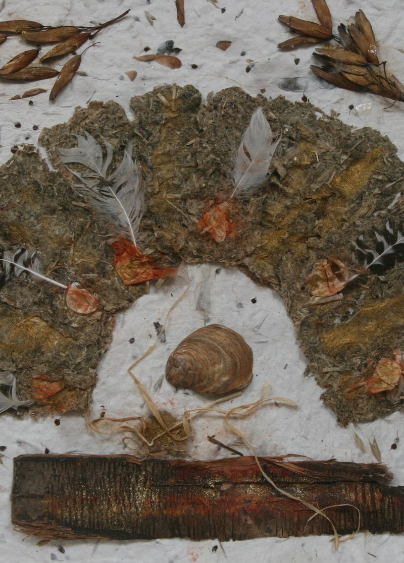 Dit is kleiner formaat werk. De vierkante zijn 40 x 40 cm en de langwerpige zijn 30 x 40 cm. Als er papier van planten is verwerkt, is dat van brandnetel, zegge, mais of hosta. De bovenste 2 zijn gemaakt van papier gekleurd met uienschillen. De voorstelling onder de tekst is voornamelijk gemaakt van zijdevezel.