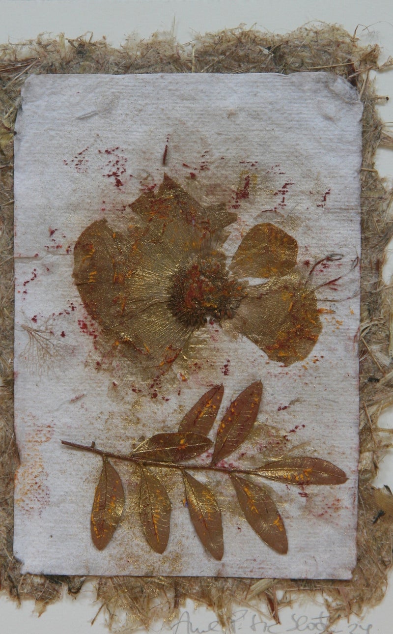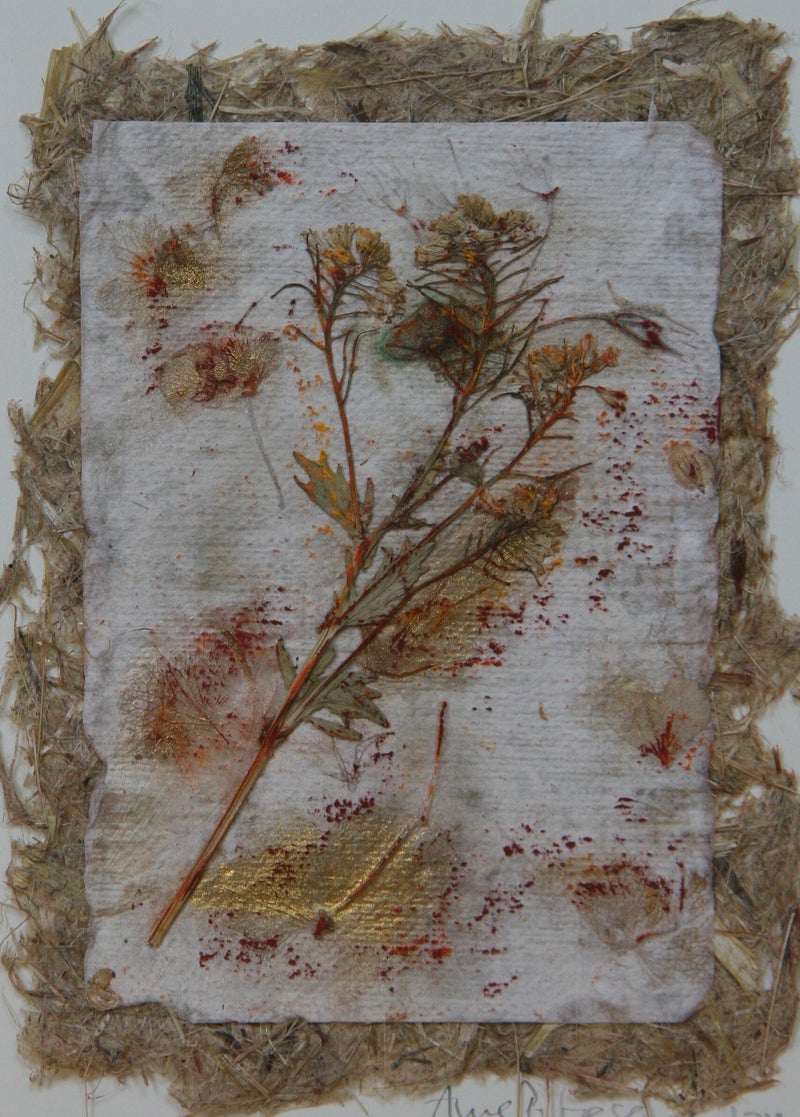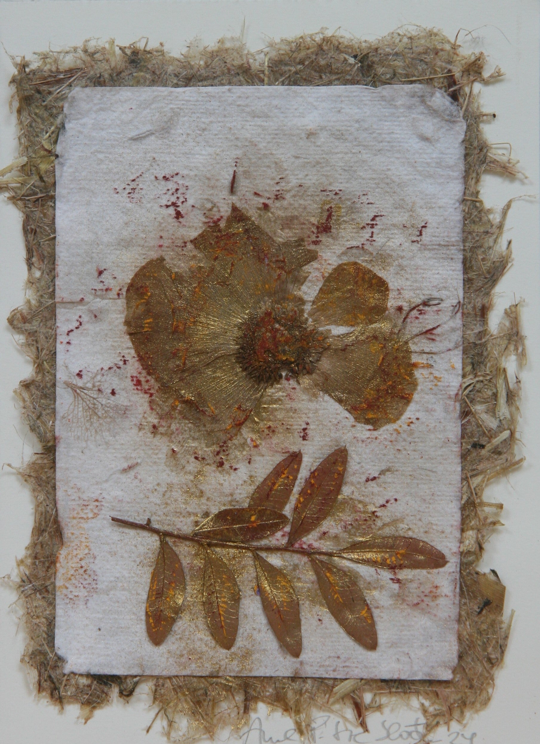 Zoals je hier ziet maak ik ook kaarten. Ik gebruik handgeschept papier van planten, zoals brandnetel, zegge, hosta en mais. Daarnaast gebruik ik zijdevezel, wol en ander materiaal als bloembladeren, takjes, veertjes etc. en krijt en goudpoeder. De dubbele kaarten zijn op A5 formaat. Van iedere kaart is er maar 1 exemplaar.